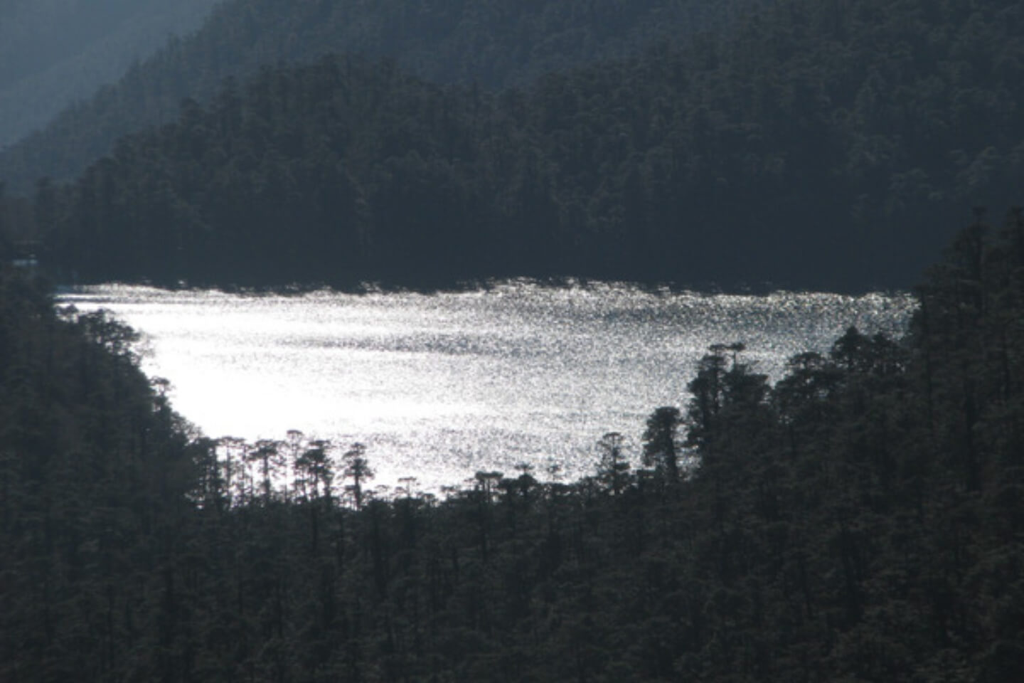 The quiet, green waters of Menmecho Lake look beautiful next to the snowy mountains behind it. Menmecho Lake is the starting point for the Rangpo Chu River, which eventually flows into the Teesta River.