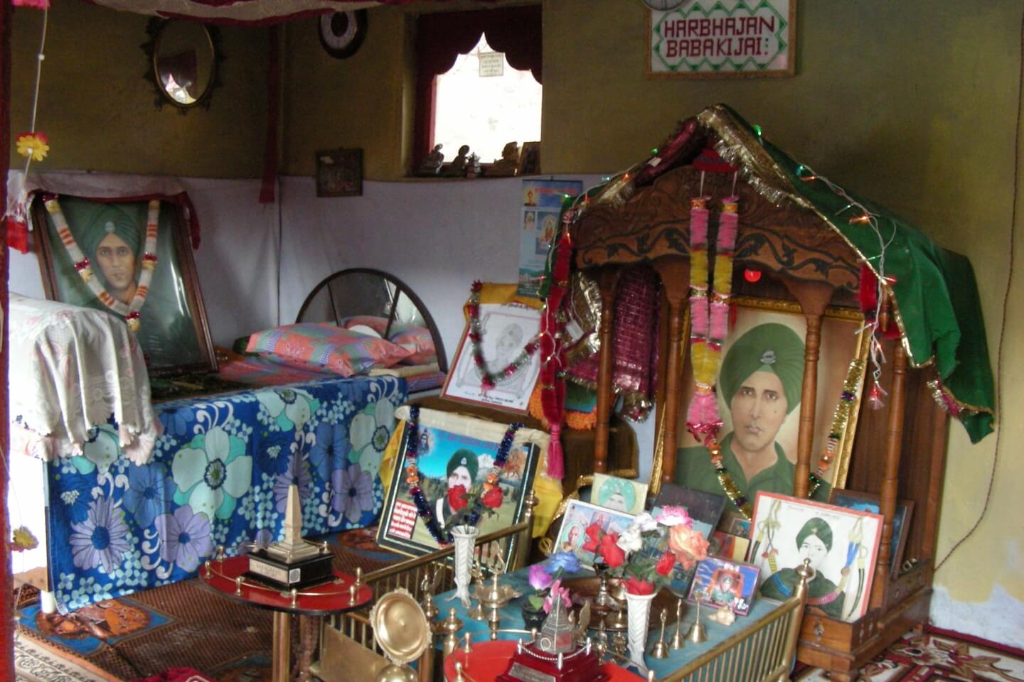 The Baba Harbhajan Singh temple has three rooms, with the central room featuring a large portrait of Baba. The second room is his personal room, where his clothes, shoes, slippers and a sleeping camp bed have been kept. There is another small room in the complex, which is used as an office-cum-storeroom, where all offerings made to him are stored.